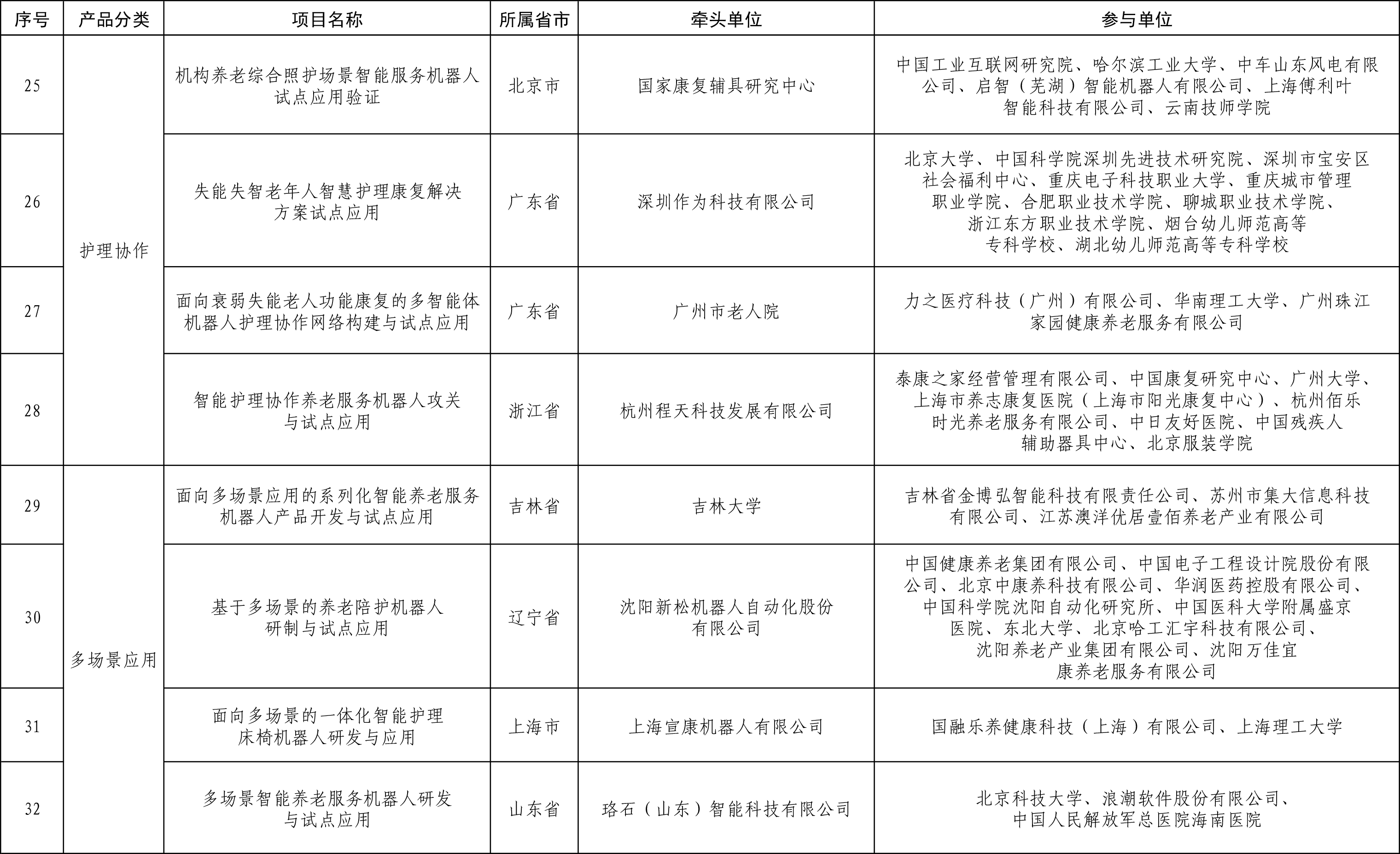 根据《工业和信息化部办公厅 民政部办公厅关于开展智能养老服务机器人结对攻关与场景应用试点工作的通知》要求,工业和信息化部、民政部联合开展智能养老服务机器人结对攻关与场景应用试点项目遴选工作,经地方推荐、综合评估、专家评审、公示等程序,确定《智能情感陪护机器人关键技术攻关与试点应用》等32个项目入围智能养老服务机器人结对攻关与场景应用试点项目名单,现予以公布。